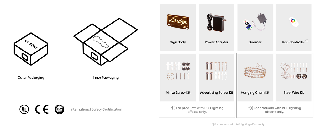 Includes 1 "Moon & Bat & Cat" neon sign, 1 power adapter, 1 set of mounting hardware (screws and chains), and a detailed installation guide.
